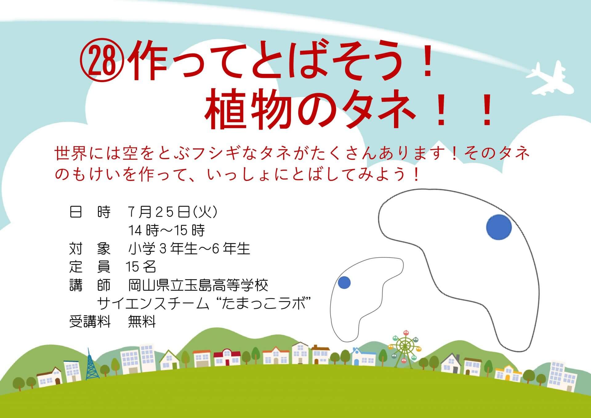 ㉘作ってとばそう!植物のタネ!! 夏のこうざ案内2023 2023-05-18 favorite 気になる! ㉘作ってとばそう!植物のタネ!! 終了しました 世界には空をとぶフシギなタネがたくさんあります!そのタネのもけいを作って、いっしょにとばしてみよう! 開催日 2023/7/25 (火) 時間 14:00~15:00 講師 岡山県立玉島高等学校 サイエンスチーム“たまっこラボ” 受講料 無料 対象 子ども / 大人 対象詳細 小学3年生~6年生 定員 15名
