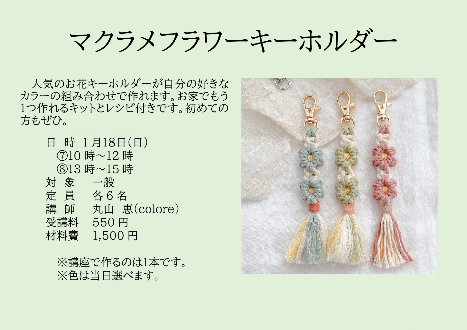 | 人気のお花キーホルダーが自分の好きなカラーの組み合わせで作れます。お家でもう1つ作れるキットとレシピ付きです。初めての方もぜひ。 ※講座で作るのは1本です。 ※色は当日選べます。 |