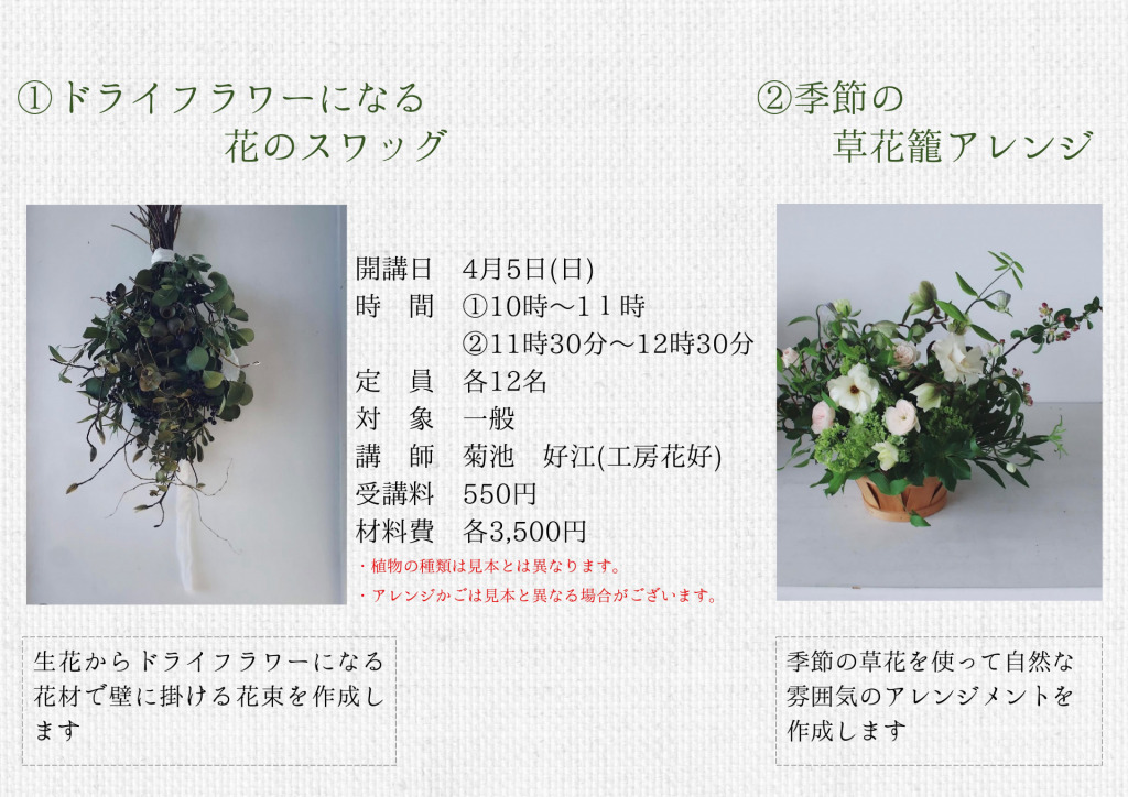 ドライフラワーになる花のスワッグ/季節の草花籠アレンジ 春のこうざ案内2026 2026-02-13 favorite 気になる! ドライフラワーになる花のスワッグ/季節の草花籠アレンジ 開催日 2026/4/5 (日) 時間 10:00~12:30 講師 菊池 好江(工房花好) 受講料 550円 材料費 各3,500円 対象 子ども / 大人 定員 各12名