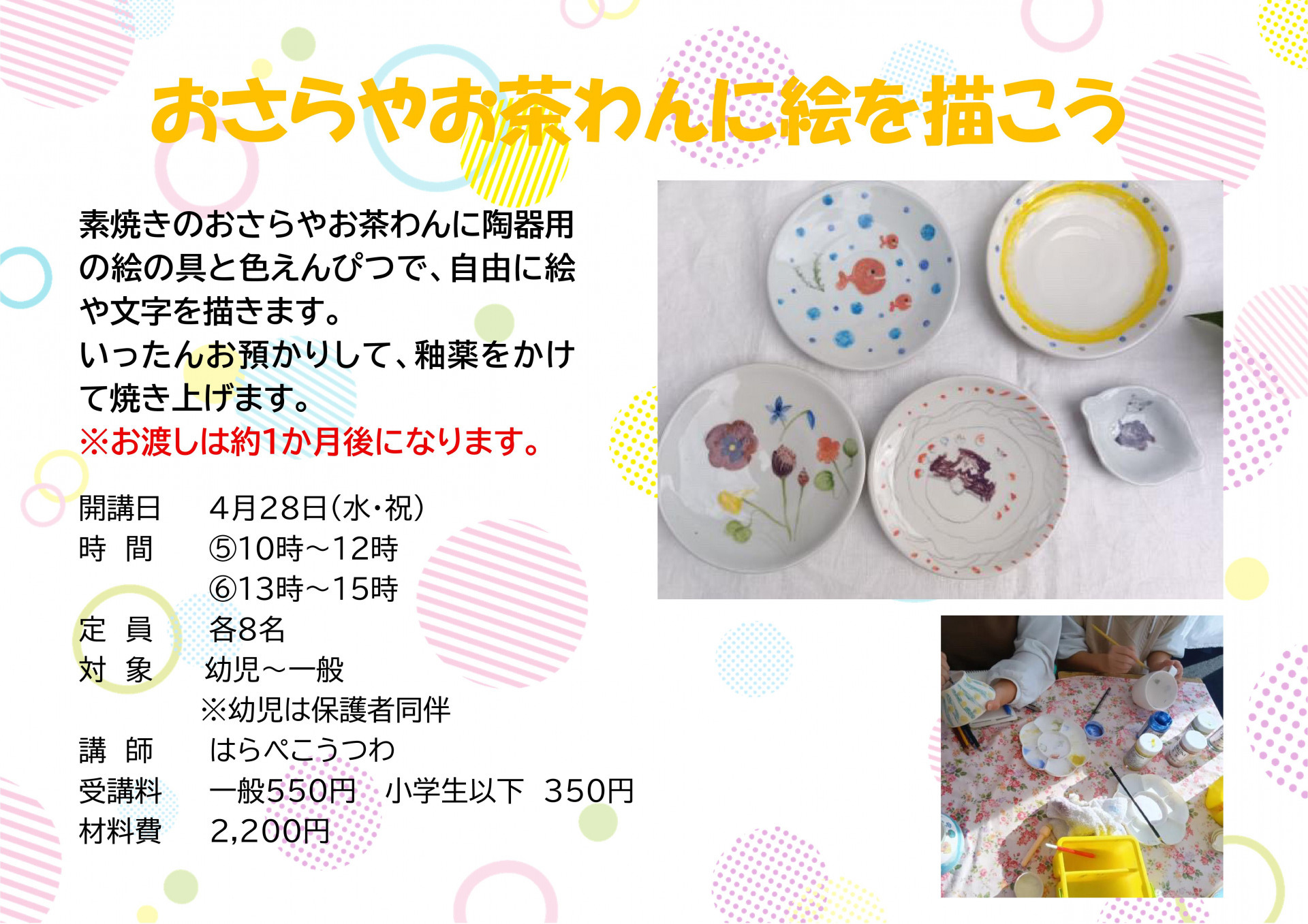 おさらやお茶わんに絵を描こう 春のこうざ案内2026 2026-02-17 favorite 気になる! おさらやお茶わんに絵を描こう 開催日 2026/4/29 (水・祝) 時間 ⑤10時~12時 ⑥13時~15時 講師 はらぺこうつわ 受講料 小学生以下350円 一般550円 材料費 2,200円 対象 子ども / 大人 定員 各8名 同伴 幼児は保護者同伴必須