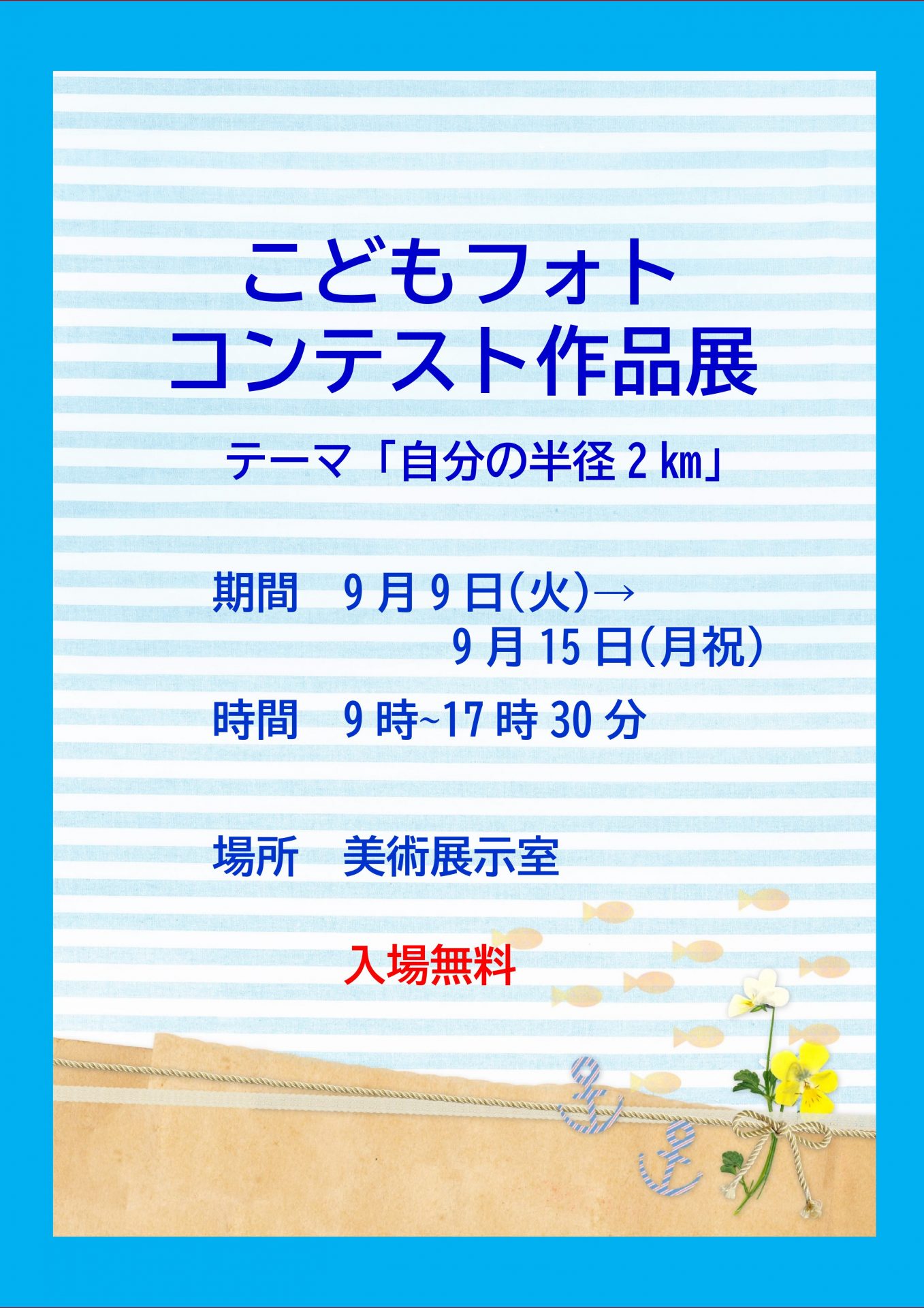 こどもフォトコンテスト作品展 展示 2023-03-27 favorite 気になる! イベント詳細 展示期間 2025/9/9 (火) 9:00 - 2025/9/15 (月・祝) 17:30 開場時間 9:00 閉場時間 18:00 場所 玉島市民交流センター 美術展示室 主催者 玉島市民交流センター(086-526-1400) 入場料 無料 こどもフォトコンテスト作品展 開催日時:令和7年9月9日(火)~令和7年9月15日(月祝)9時~17時30分8月1日~8月31日にかけて募集した、コンテスト参加者の写真展です。 今年のテーマは「自分の半径2㎞」人物や風景、生き物など素敵な作品を展示します。