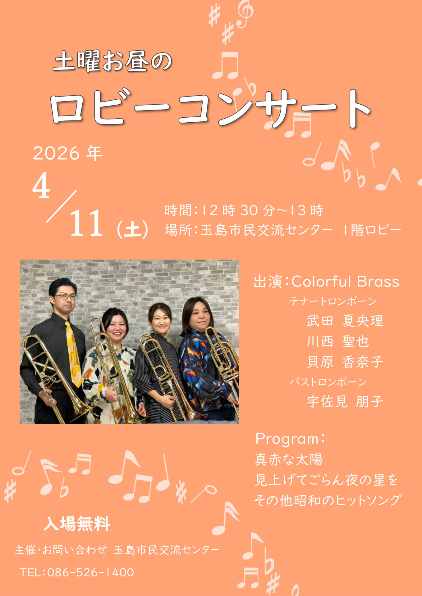 土曜お昼のロビーコンサート コンサート 2024-06-12 favorite 気になる! イベント詳細 開催日時 2026/4/11 (土) 12:30 - 13:00 開演時間 12:30 終演時間 13:00 場所 玉島市民交流センター 交流棟ロビー 主催者 玉島市民交流センター(086-526-1400) 入場料 無料